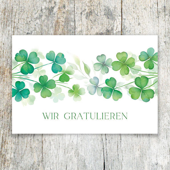 Glückwunschkarten mit vierblättrigen Kleeblättern und „Wir gratulieren“ – natürlich und wertschätzend