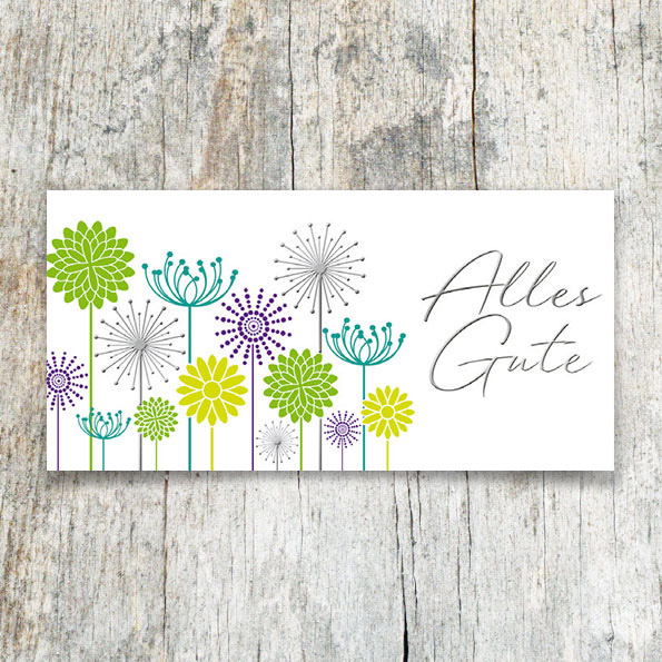 Diese eleganten Glückwunschkarten im DIN lang Querformat kombinieren stilvolle Gestaltung mit hochwertiger Veredelung. Der Schriftzug „Alles Gute“ ist zusammen mit Blumenmotiven in metallisch glänzender Optik auf die weiße Vorderseite gedruckt – ein visuelles Highlight für viele Anlässe.
